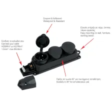 14,87 €Διαθέτει ενσωματωμένο μαύρο καλώδιο 3x1.5mm2 και προστασία υπέρτασης. Διαθέτει 5 πρίζες τύπου σούκο 16A υπό γωνία 45° για ταυτόχρονη τοποθέτηση πολλών συσκευών. Προσφέρεται.Στεγανό πολύπριζο από λάστιχο 3 θέσεων χωρίς καλώδιο IP44 ΗΜΡΡ/02743